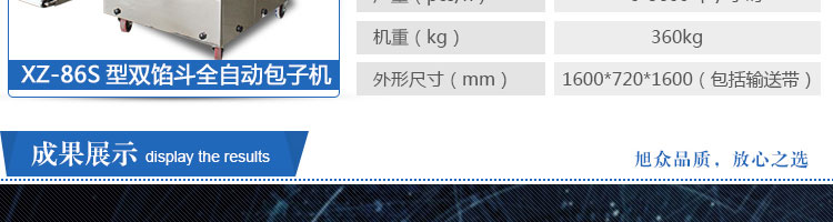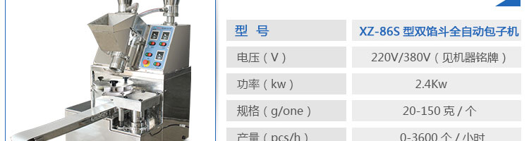XZ-86S型雙餡斗全自動包子機,可生產各種肉包、肉菜包、菜包、小籠包、湯包、水晶包、圓饅頭、奶黃包、豆沙包、叉燒包、南瓜餅等幾十種包餡制品。適用于賓館、飯店、學校、機關企業食堂、饅頭或包子加工廠、早餐工程店及速凍食品廠等單位。可滿足不同客戶群體。免費提供工藝技術。免費上門培訓指導安裝。