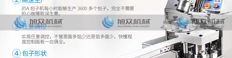 名稱XZ-85A全自動(dòng)包子機(jī) 電源220/380v 功率2.4kw 產(chǎn)量 尺寸1600*720*1600mm 重量390kg 規(guī)格20-150克/只 其他
