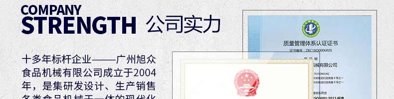 廣州旭眾食品機(jī)械有限公司是一家集科研開(kāi)發(fā),生產(chǎn)設(shè)計(jì),營(yíng)銷(xiāo)服務(wù)為一體的現(xiàn)代化生產(chǎn)企業(yè)。現(xiàn)代化生產(chǎn)車(chē)間,精湛制造技術(shù),所產(chǎn)機(jī)械歷經(jīng)市場(chǎng)重重考驗(yàn),不斷贏得海內(nèi)外客戶的贊譽(yù)。