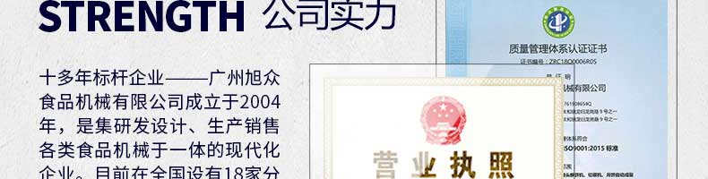 廣州旭眾食品機械有限公司是一家集科研開發,生產設計,營銷服務為一體的現代化生產企業?,F代化生產車間,精湛制造技術,所產機械歷經市場重重考驗,不斷贏得海內外客戶的贊譽。