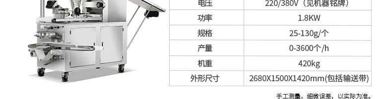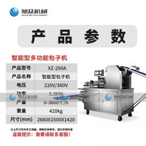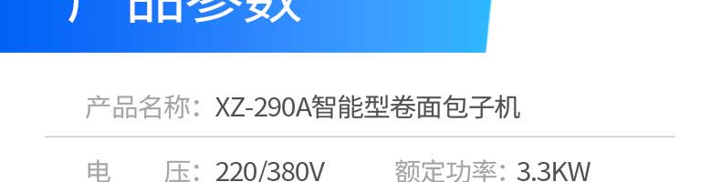 名稱XZ-290A智能卷式包子機 電源220/380v 功率3.3kw 產量0-36000個/h 尺寸2680*1500*1420mm 重量420kg 規(guī)格 其他