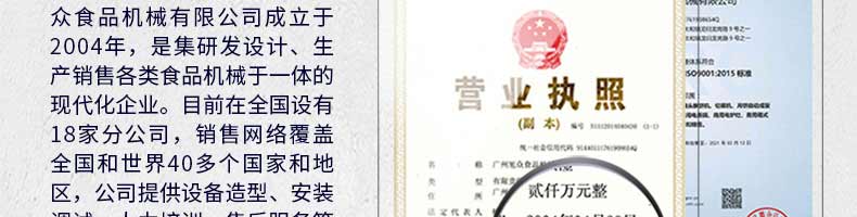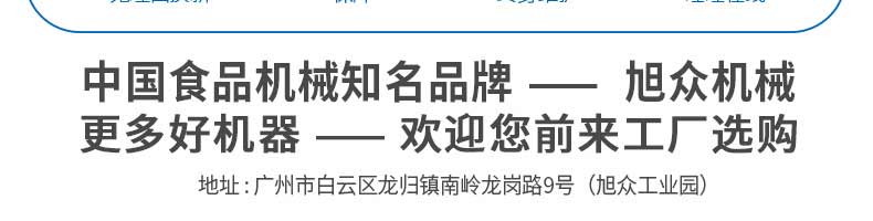 廣州旭眾食品機械有限公司是一家集科研開發(fā),生產設計,營銷服務為一體的現(xiàn)代化生產企業(yè)。現(xiàn)代化生產車間,精湛制造技術,所產機械歷經市場重重考驗,不斷贏得海內外客戶的贊譽。