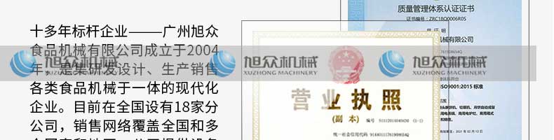 廣州旭眾食品機械有限公司是一家集科研開發,生產設計,營銷服務為一體的現代化生產企業。現代化生產車間,精湛制造技術,所產機械歷經市場重重考驗,不斷贏得海內外客戶的贊譽。