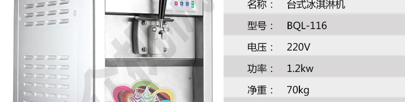 BQL-116臺式冰淇淋機(jī),●選用國際名牌成熟制冷配套件和高效壓縮機(jī),融合旭眾精湛工藝輔以嚴(yán)格的質(zhì)量控制流程,使產(chǎn)品整體性能及品質(zhì)得以全面提升?!癫捎萌珨?shù)字電腦控制系統(tǒng),選用名牌優(yōu)質(zhì)電器元件,先進(jìn)的生產(chǎn)工藝,故障診斷,軟硬任意調(diào)制,自動修復(fù)功能,安全精確,可靠性更高?!駥I(yè)成熟制冷系統(tǒng)設(shè)計(jì),選用世界名牌大功率專用壓縮機(jī),大大縮短冰淇淋成型時(shí)間,相同時(shí)間內(nèi)冰淇淋產(chǎn)量大幅度增加,使您生意火爆時(shí)依然得心應(yīng)手,為您創(chuàng)造財(cái)富?!癜踩椒€(wěn)的機(jī)械攪拌系統(tǒng),噪音更低、振動更小,使整機(jī)運(yùn)行性能達(dá)到國際先進(jìn)水平?!翊_保進(jìn)料溫度在0°C~35°C;環(huán)境溫度5°C~40°C勻可正常使用。