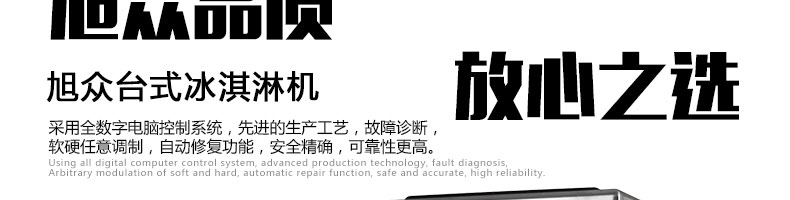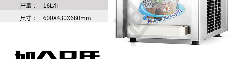 BQL-216T臺式冰淇淋機,●選用國際名牌成熟制冷配套件和高效壓縮機,融合旭眾精湛工藝輔以嚴格的質量控制流程,使產品整體性能及品質得以全面提升。●采用全數字電腦控制系統,選用名牌優質電器元件,先進的生產工藝,故障診斷,軟硬任意調制,自動修復功能,安全精確,可靠性更高。●專業成熟制冷系統設計,選用世界名牌大功率專用壓縮機,大大縮短冰淇淋成型時間,相同時間內冰淇淋產量大幅度增加,使您生意火爆時依然得心應手,為您創造財富。●安全平穩的機械攪拌系統,噪音更低、振動更小,使整機運行性能達到國際先進水平。●確保進料溫度在0°C~35°C;環境溫度5°C~40°C勻可正常使用。