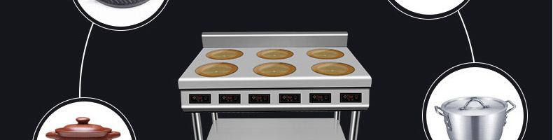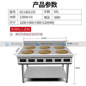 名稱XZ-LBZL210圓頭六頭電陶爐 電源380V 功率3.5KW*6 產(chǎn)量聯(lián)系銷售員 尺寸1200×800×800+120MM 重量聯(lián)系銷售員 規(guī)格頭數(shù):6頭 其他