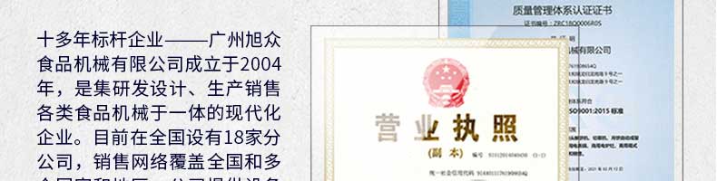 廣州旭眾食品機(jī)械有限公司是一家集科研開(kāi)發(fā),生產(chǎn)設(shè)計(jì),營(yíng)銷(xiāo)服務(wù)為一體的現(xiàn)代化生產(chǎn)企業(yè)。現(xiàn)代化生產(chǎn)車(chē)間,精湛制造技術(shù),所產(chǎn)機(jī)械歷經(jīng)市場(chǎng)重重考驗(yàn),不斷贏(yíng)得海內(nèi)外客戶(hù)的贊譽(yù)。