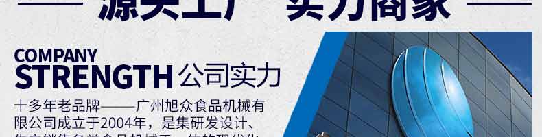 廣州旭眾食品機(jī)械有限公司是一家集科研開(kāi)發(fā),生產(chǎn)設(shè)計(jì),營(yíng)銷服務(wù)為一體的現(xiàn)代化生產(chǎn)企業(yè)。現(xiàn)代化生產(chǎn)車間,精湛制造技術(shù),所產(chǎn)機(jī)械歷經(jīng)市場(chǎng)重重考驗(yàn),不斷贏得海內(nèi)外客戶的贊譽(yù)。