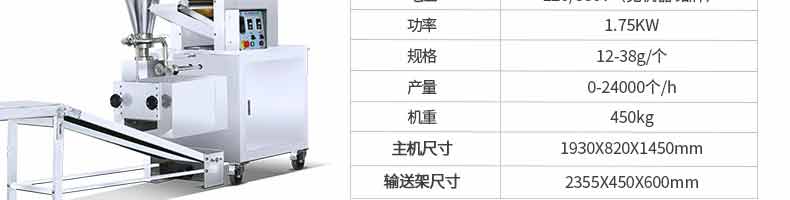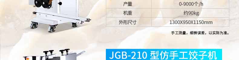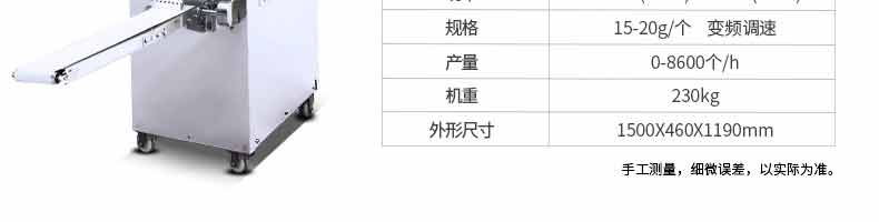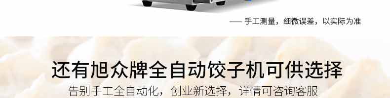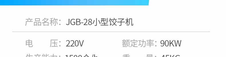 名稱28小型餃子機 電源220V 功率90KW 產量1500個/h 尺寸350*370*480mm 重量45KG 規格 其他