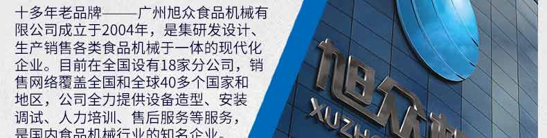 廣州旭眾食品機械有限公司是一家集科研開發,生產設計,營銷服務為一體的現代化生產企業。現代化生產車間,精湛制造技術,所產機械歷經市場重重考驗,不斷贏得海內外客戶的贊譽。