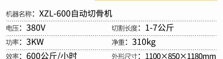 名稱XZL-600切骨機 電源380V 功率3kw 產量600公斤/小時 尺寸1100*850*1180MM 重量310kg 規格 其他