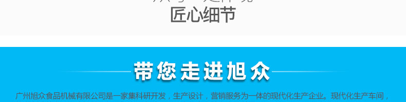廣州旭眾食品機械有限公司是一家集科研開發,生產設計,營銷服務為一體的現代化生產企業。現代化生產車間,精湛制造技術,所產機械歷經市場重重考驗,不斷贏得海內外客戶的贊譽。