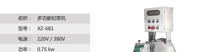 名稱XZ-681多功能切菜機 電源220/380V(見機器銘牌) 功率0.75kw 產量500-800千克/小時 尺寸770*460*1400mm 重量70kg 規格 其他