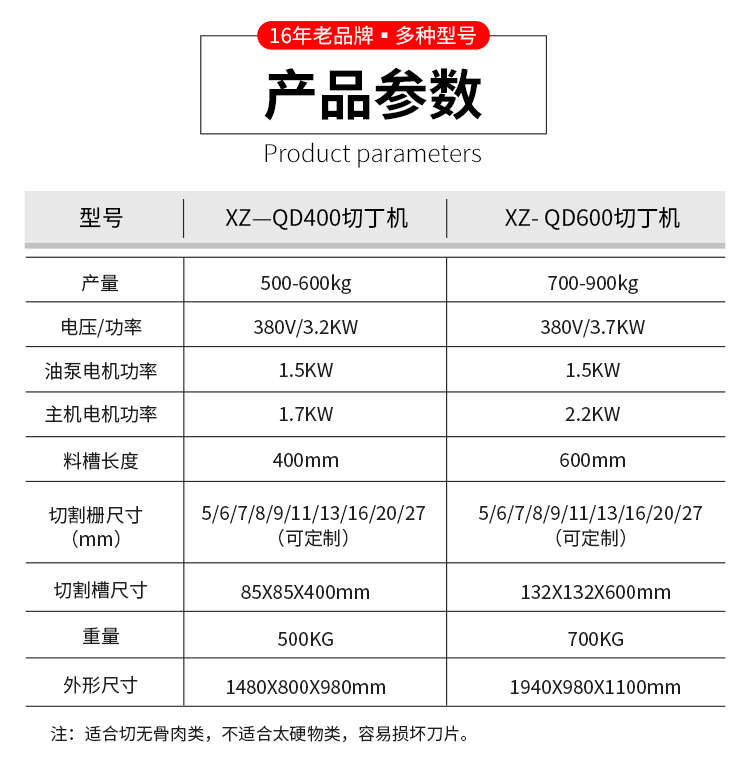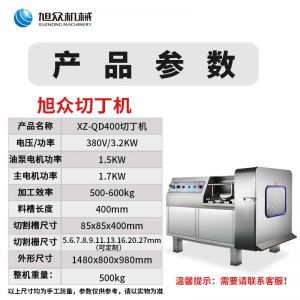 名稱XZ-QD400切丁機 電源380V 功率主:3.2KW。油泵電機功率1.5KW,主機電機功率1.7KW 產量500-600kg 尺寸切割槽尺寸85X85X400mm,外形尺寸1480X800X980mm 重量500KG 規格料槽長度400mm,切割柵尺寸5/6/7/8/9/11/13/16/20/27(mm)(可定制) 其他