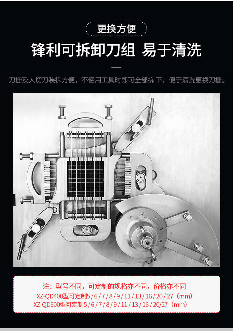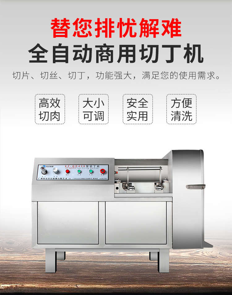 XZ-QD400切丁機,替您排憂解難全自動商用切丁機切片、切絲、切丁,功能強大,滿足您的使用需求。多功能&實用人即可操作,切出自己想要的規格,滿足商用多種需求。