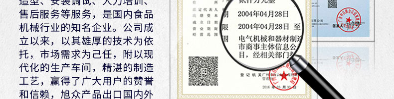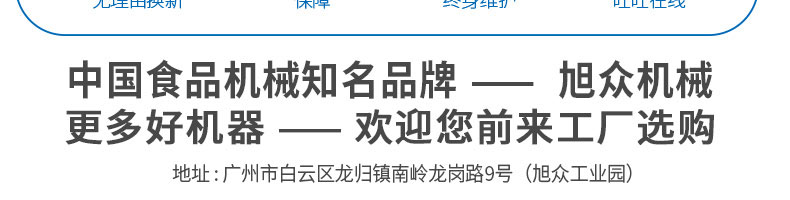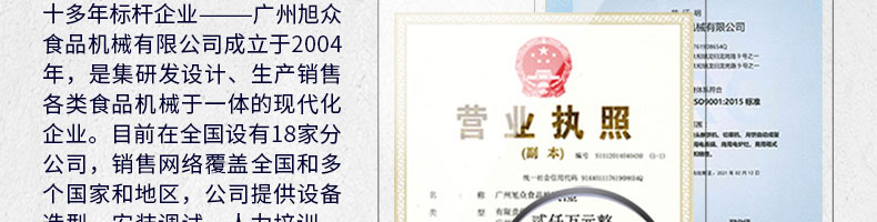 廣州旭眾食品機械有限公司是一家集科研開發,生產設計,營銷服務為一體的現代化生產企業?,F代化生產車間,精湛制造技術,所產機械歷經市場重重考驗,不斷贏得海內外客戶的贊譽。