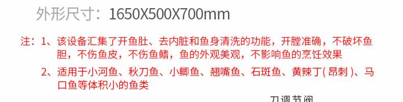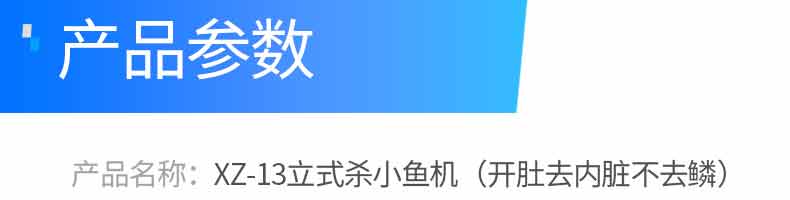名稱XZ-13型立式小殺魚機(開肚不去鱗) 電源220V 功率1.1kw 產量1-3條/秒 尺寸1650x500x700mm 重量110kg 規格 其他殺魚范圍 5-15cm