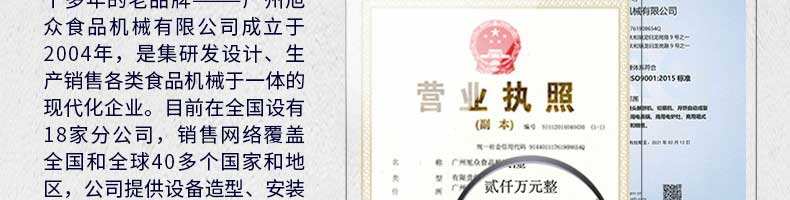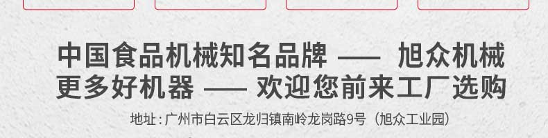 廣州旭眾食品機械有限公司是一家集科研開發,生產設計,營銷服務為一體的現代化生產企業?,F代化生產車間,精湛制造技術,所產機械歷經市場重重考驗,不斷贏得海內外客戶的贊譽。
