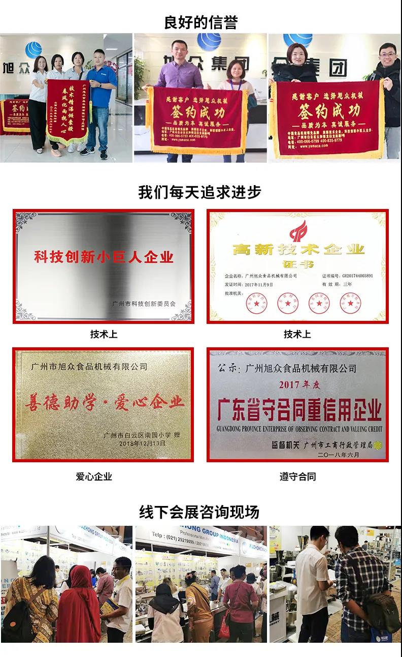 廣州旭眾食品機械有限公司是一家集科研開發,生產設計,營銷服務為一體的現代化生產企業。現代化生產車間,精湛制造技術,所產機械歷經市場重重考驗,不斷贏得海內外客戶的贊譽。