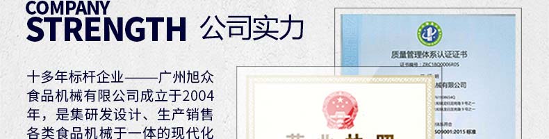 廣州旭眾食品機(jī)械有限公司是一家集科研開(kāi)發(fā),生產(chǎn)設(shè)計(jì),營(yíng)銷(xiāo)服務(wù)為一體的現(xiàn)代化生產(chǎn)企業(yè)。現(xiàn)代化生產(chǎn)車(chē)間,精湛制造技術(shù),所產(chǎn)機(jī)械歷經(jīng)市場(chǎng)重重考驗(yàn),不斷贏得海內(nèi)外客戶(hù)的贊譽(yù)。