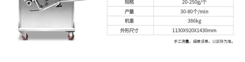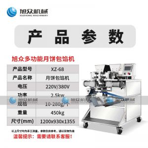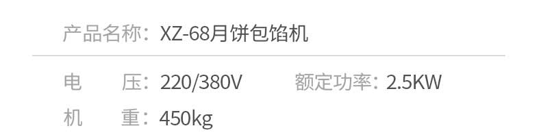 名稱XZ-68月餅包餡機 電源220/380V 功率2.5KW 產量各型號不同,請咨詢銷售員 尺寸1200X930×1355mm 重量450kg 規格各型號不同,請咨詢銷售員 其他