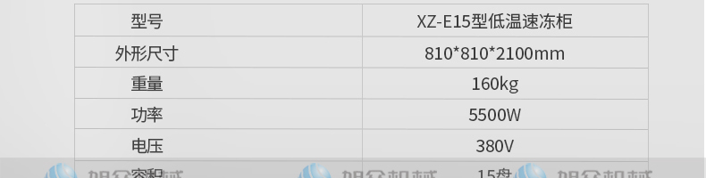 名稱XZ-E10速凍柜 電源220V 功率3300W 產(chǎn)量容積10盤 尺寸810*810*1600mm 重量130kg 規(guī)格溫度范圍-40°C~0°C 其他